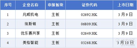 3月1日至3月7日期间,兆威机电、埃斯顿、优乐赛共享、美格智能启动招股并已结束待上市。