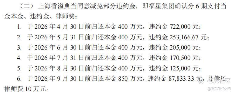 诉讼过程中,双方就债务清偿事宜进行了多次协商,最终达成调解共识。根据2026年3月2日法院出具的调解书,截至调解当日,福星集团又偿还了294.76万元,双方确认剩余欠款包括本金2850万元、截至2026年2月13日的违约金262.97万元、后续按年利率24%计算的违约金以及律师费10万元。同时,双方约定了分6期的还款计划。