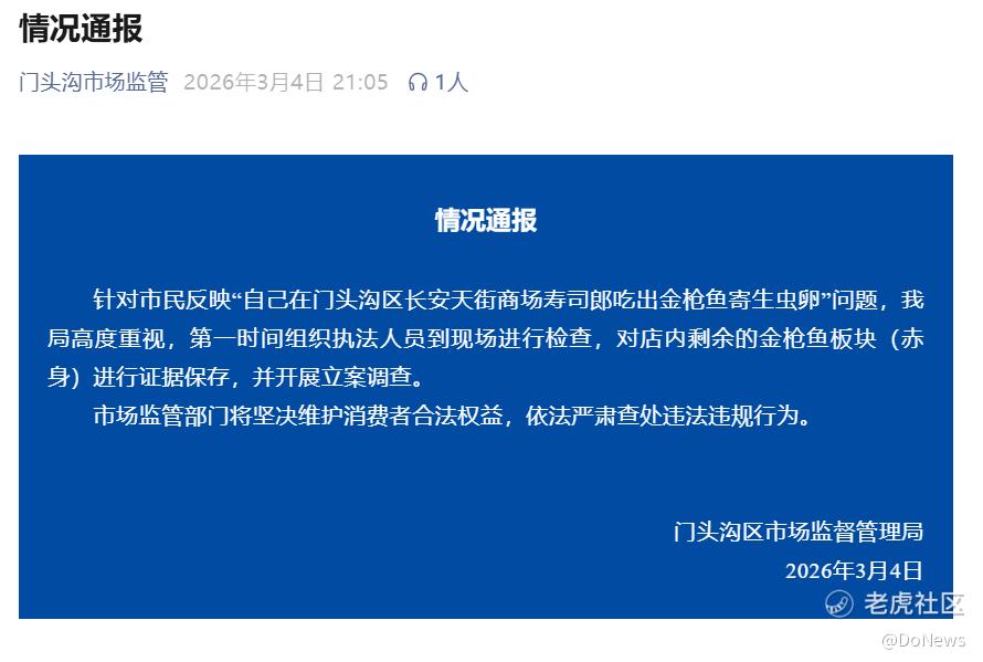 关于“异物到底是什么”,门头沟区市场监督管理局2026年3月4日在“门头沟市场监管”公众号发布“情况通报”称,“针对市民反映‘自己在门头沟区长安天街商场寿司郎吃出金枪鱼寄生虫卵’问题,我局高度重视,第一时间组织执法人员到现场进行检查,对店内剩余的金枪鱼板块(赤身)进行证据保存,并开展立案调查。”该通报进一步指出,“市场监管部门将坚决维护消费者合法权益,依法严肃查处违法违规行为。”