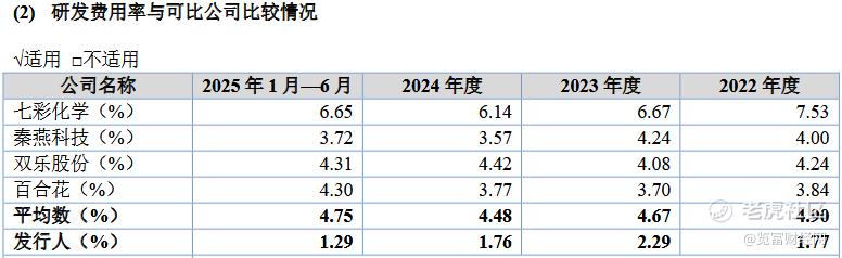根据招股书,2022年至2024年及2025年上半年,彩客科技的研发费用分别为639万元、865万元、800万元和366万元,占营业收入的比重分别为1.77%、2.29%、1.76%和1.29%,而可比公司的研发费用平均值分别为6645万元、6238万元、6963万元和3522万元,占营业收入比例分别为4.90%、4.67%、4.48%和4.75%。通过两组数据对比不难看出,彩客科技的研发投入明显落后于同行。