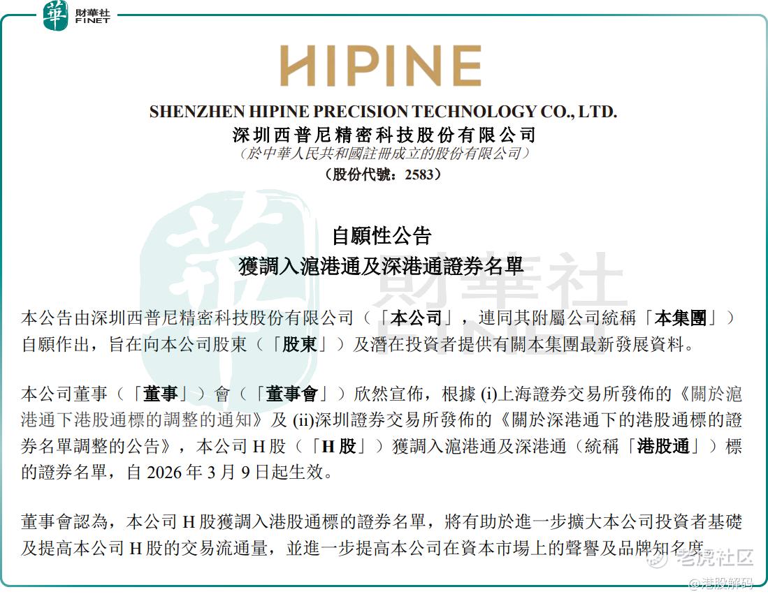 3月8日,西普尼发布公告,根据上海证券交易所发布的《关于沪港通下港股通标的调整的通知》及深圳证券交易所发布的《关于深港通下的港股通标的证券名单调整的公告》,公司H股获调入港股通标的证券名单,自2026年3月9日起生效。