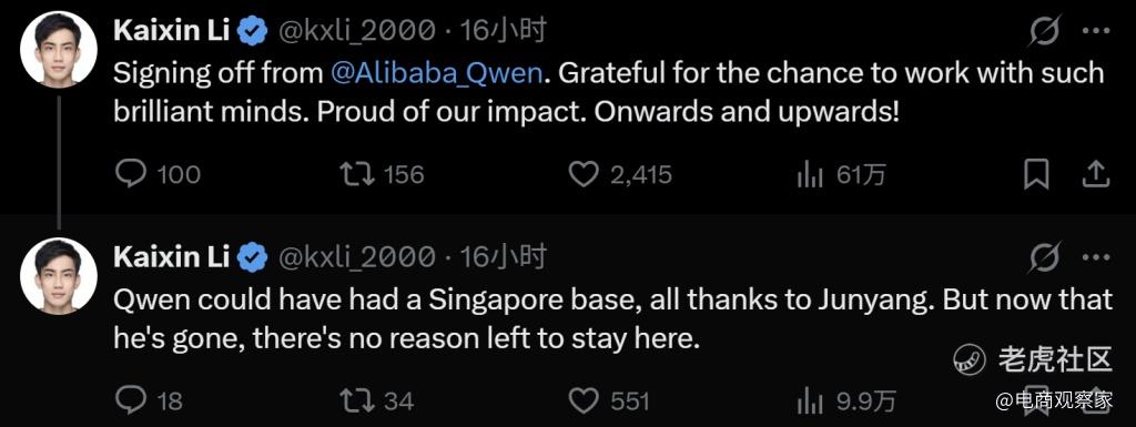 更值得注意的是,这并非一次孤立的离职。Qwen团队研究科学家惠彬原(Binyuan Hui),Qwen-Coder系列的主要技术负责人,以及研究者Kaixin Li几乎在同一时间更新了个人状态,宣布离开。Kaixin Li甚至在X上直言,林俊旸的离开让他“没有了留下来的理由”。