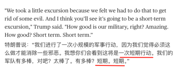 特朗普用 “short-term excursion” 这种接近“短途行动”的表达来形容战争,本质是在刻意淡化冲突的持续时间。这意味着美国方面希望把这次军事行动框定为一次有限打击,而不是长期战争。