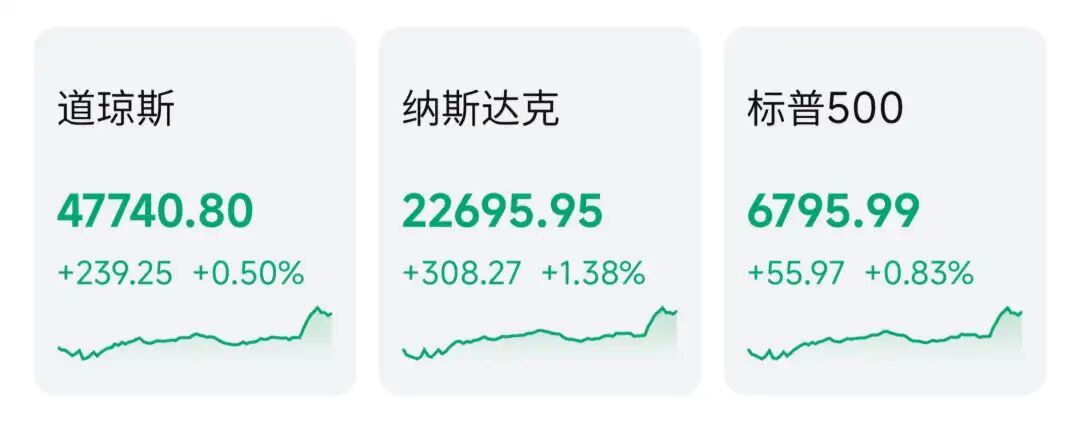 最终,美股三大指数全线收涨。标普500收涨0.8%;纳指收涨1.4%;道指收涨0.5%;罗素2000收涨1.1%。