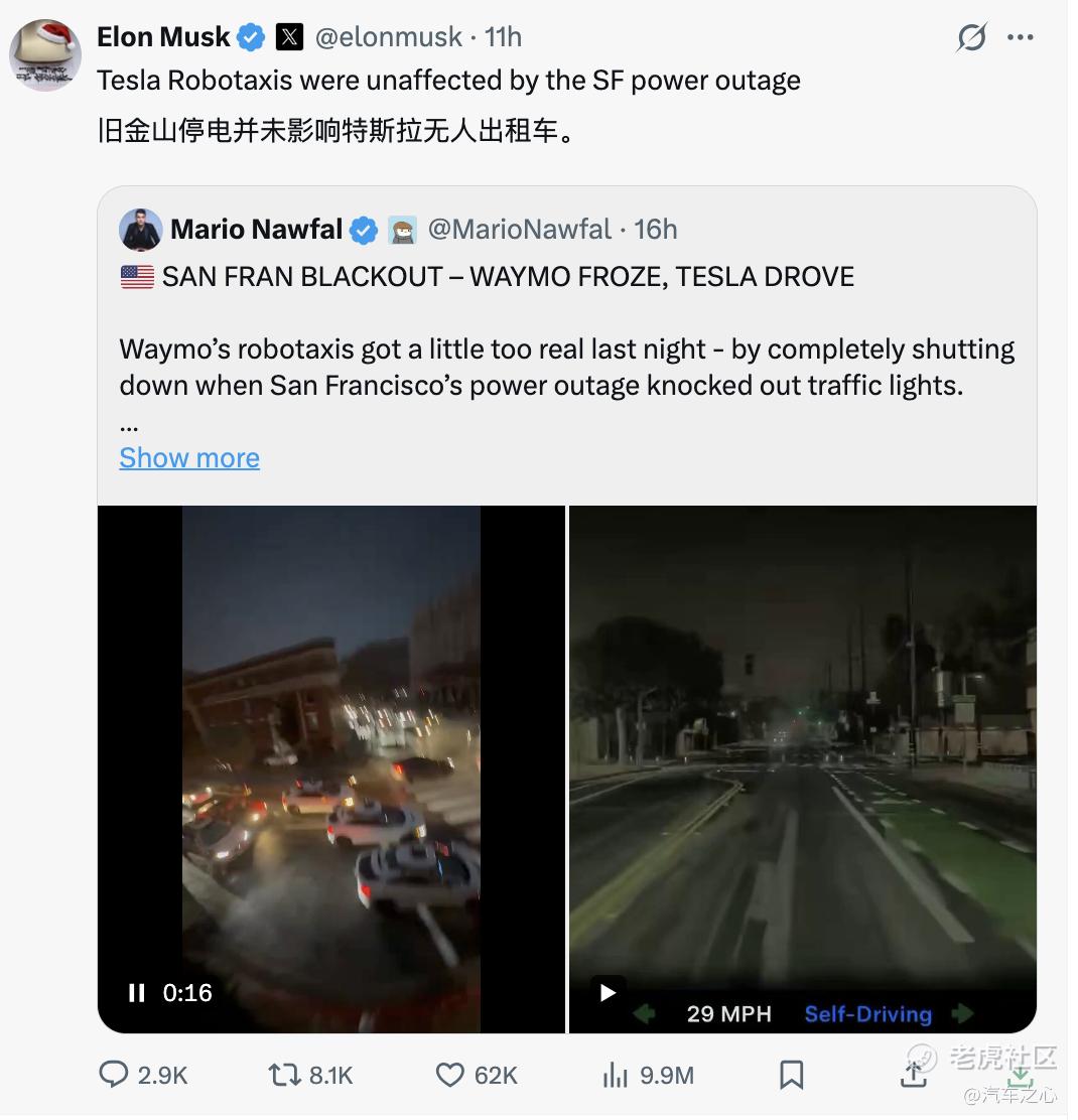 3 个月前硅谷市区大停电,红路灯全部瘫痪,没有了基本交通规则后,Waymo 的车只能瘫痪在路中间。与之对比,特斯拉的 Robotaxi 丝毫没有受到影响。