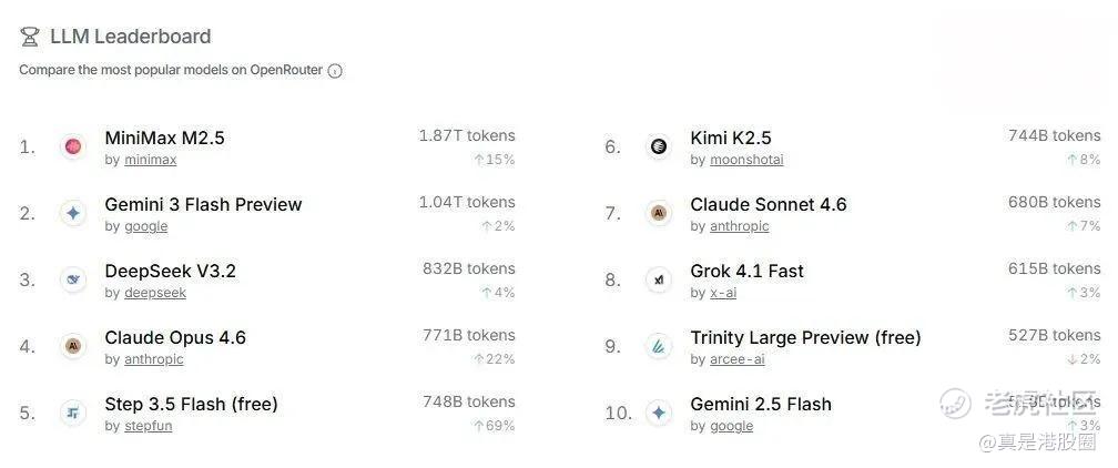 数据最有说服力。根据OpenRouter最新数据,上周国内大模型调用量环比上涨34.9%,连续两周超过美国,其中多只中国大模型跻身全球调用量前五,展现出强劲的产业活力。