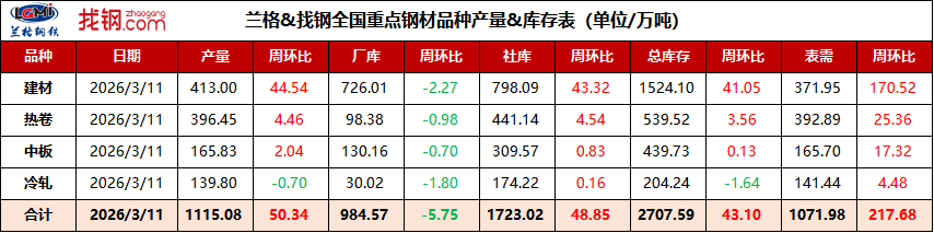 兰格钢铁网&找钢网 全国重点钢材品种产量&库存表(2026.3.11)