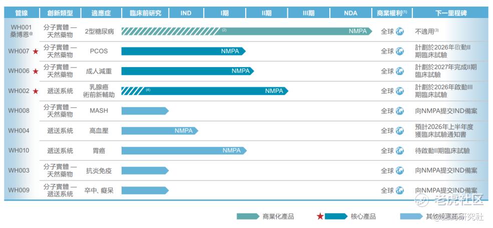 目前五和博澳也在试图打破桎梏。除了桑博恩®,公司的产品管线中还有三款核心在研产品:WH007用于多囊卵巢综合症(PCOS),WH006用于肥胖症,WH002则用于乳腺癌新辅助治疗;此外还有五款其他在研产品布局在高血压、胃癌、卒中痴呆等领域。