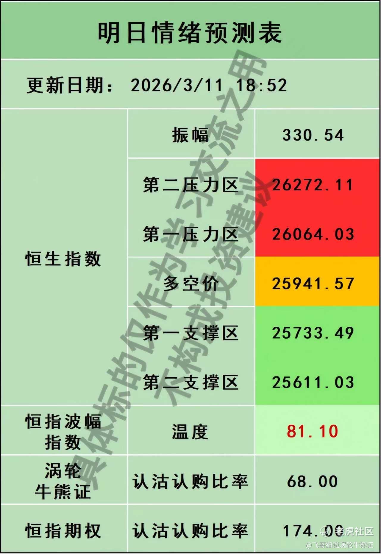 今日指数高开低走、缩量收跌,收盘价跌破今日多空价,多头力量减弱,空方抬头。“明日情绪预测表”显示今日振幅微幅收窄,恒指波幅指数温度小幅回落,散户看空情绪缓和,机构看空情绪大幅飙升至近期高位。短线以震荡偏空为主,短线交易者操作策略以逢高做空为主,仅在第一支撑区出现极端止跌信号时轻仓博弈超跌反弹,无明确信号时优先观望避险。关注关键位突破与消息面以及量能、情绪指标变化,严格执行仓位与止损,灵活应对波动,轻仓试错、趋势确认后加仓,全程严格执行风控以应对高波动与机构看空压力。