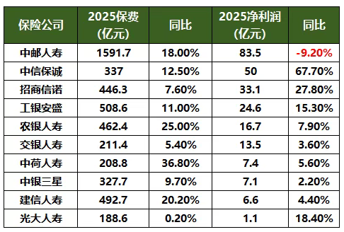 2025年中邮人寿净利润83.47亿元,同比下降9.2%,是银行系寿险公司中,唯一利润下滑的险企。