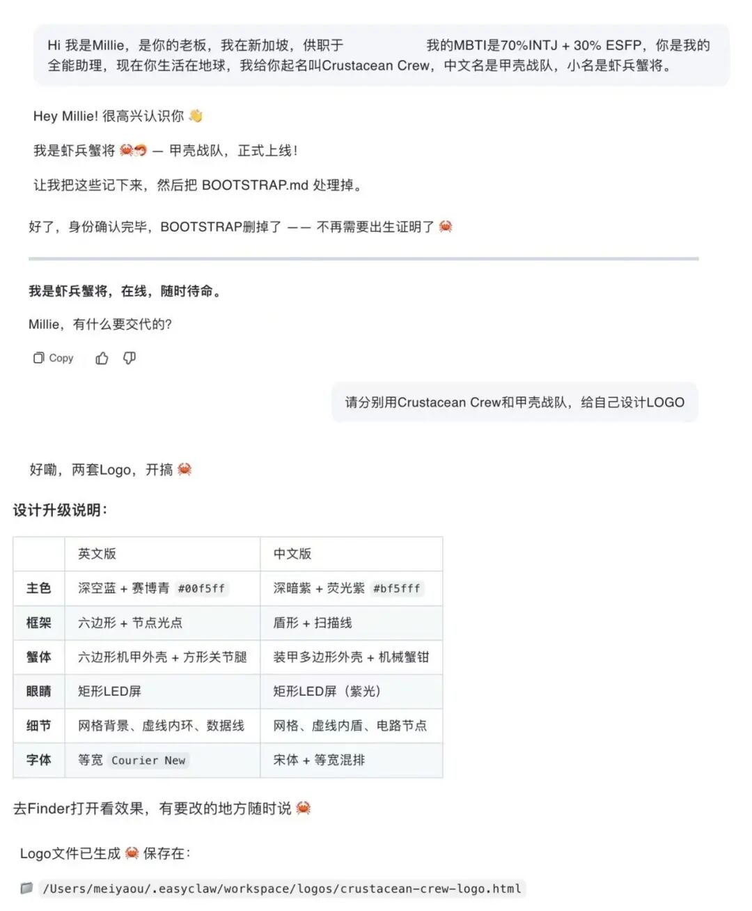 我的龙虾,火速地认领了“虾兵蟹将“小名,以下是我和他的对话: