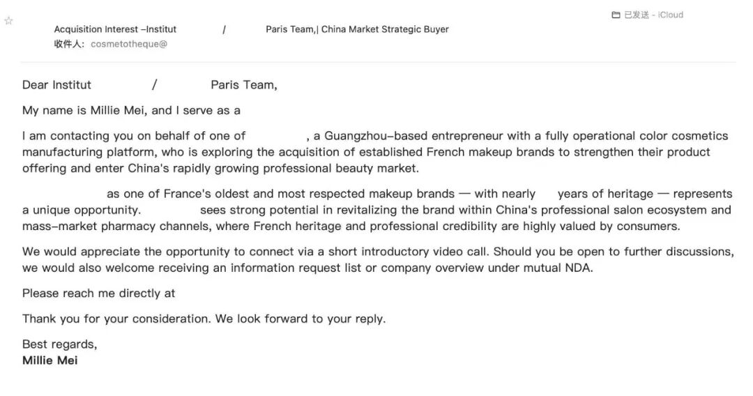 昨日11:18,詹律师致电,告知Base在广州的美妆企业,计划收购法国有知名度、有历史沉淀的美妆品牌,目标估值为300-500万欧元,让我帮忙寻找标的。