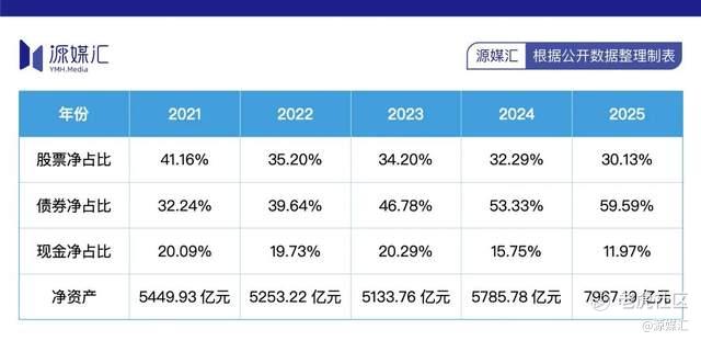 从景顺长城2021至2025年的资产结构变迁看,其规模扩张的路径清晰可见:净资产从5449.93亿元跃升至7967.19亿元,新增约2517亿元,但这些增量几乎全部涌入了债券资产——债券规模从1757亿元暴增至4748亿元,增幅近170%;而股票资产仅微增157亿元,现金资产更是缩水141亿元。
