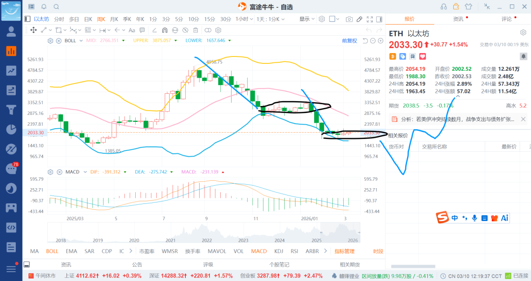 以太币也是差不多的走势,追涨的基本和比特币同步了,目前是在走第二个中枢的结构,就算后边跌那么也不是风险,反而是机会所在,当然也可能墨迹寻底,也可能继续跌一波后在起来的头肩底了。