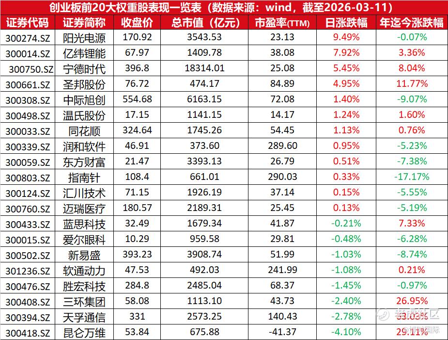 深市创业板前20大权重股表现一览表: