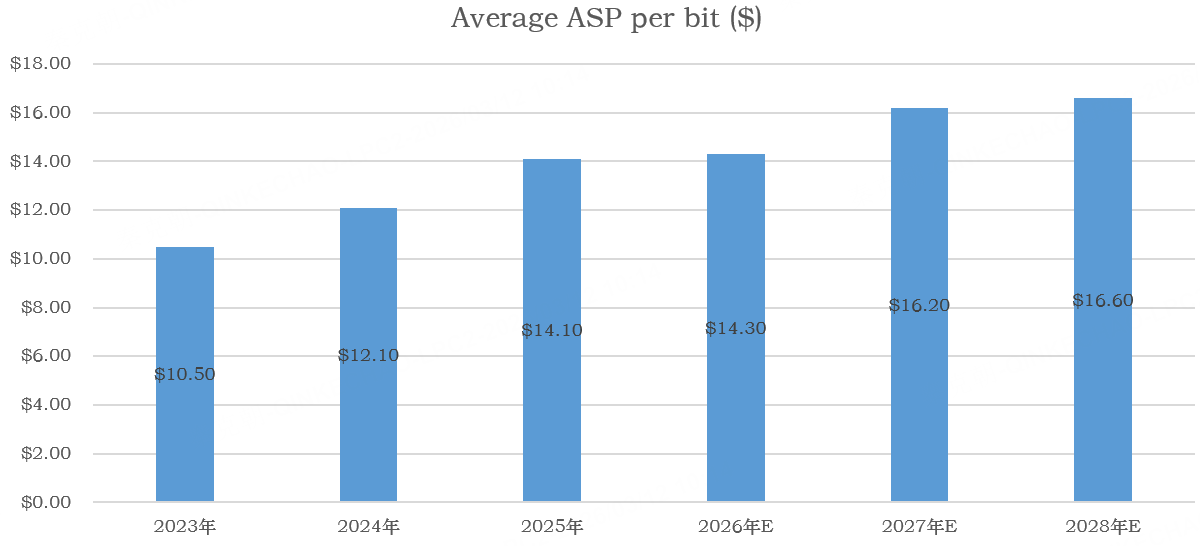 目前,分析师预期高带宽内存今年的均价将达到14.3美元/字节,预计2027年提升至16.2美元,2028年达到16.6美元: