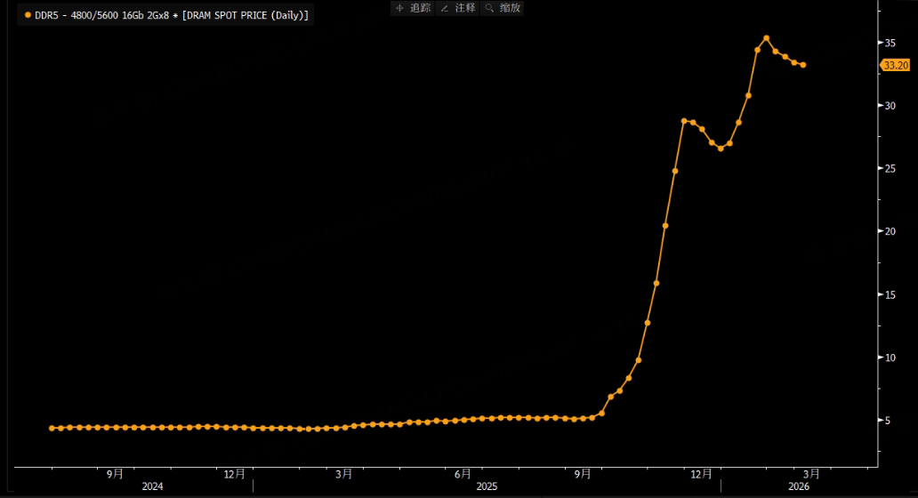 从存储芯片价格来看,以DDR5 -4800/5600 16Gb 2Gx8为例,自1月底以来,价格从35.35美元/颗下降至33.2美元: