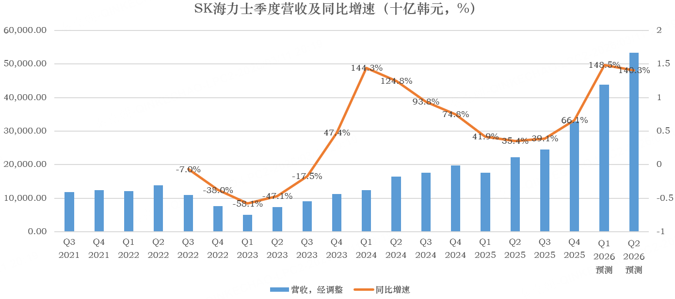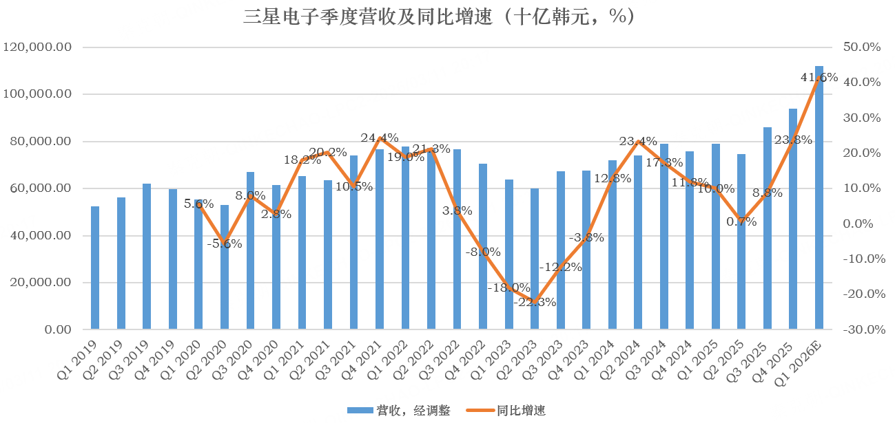 从业绩上看,三星电子和SK海力士都非常炸裂,分析师预计三星电子今年一季度营收增速在41.6%,预计SK海力士在148.5%: