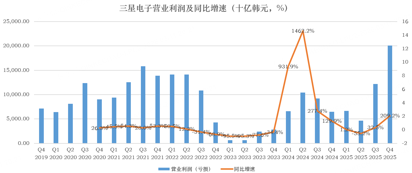 其中,三星电子的营收增速看起来差点意思,但从营业利润的角度看,去年四季度,在营收增速只有区区23.8%的情况下,营业利润同比增长了209%: