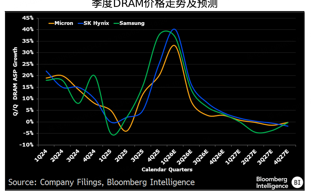目前,分析师预期自今年一季度后,DRAM(动态随机存储器)价格季度环比涨幅将从40%高位回落,2027年初,环比涨幅或接近于0: