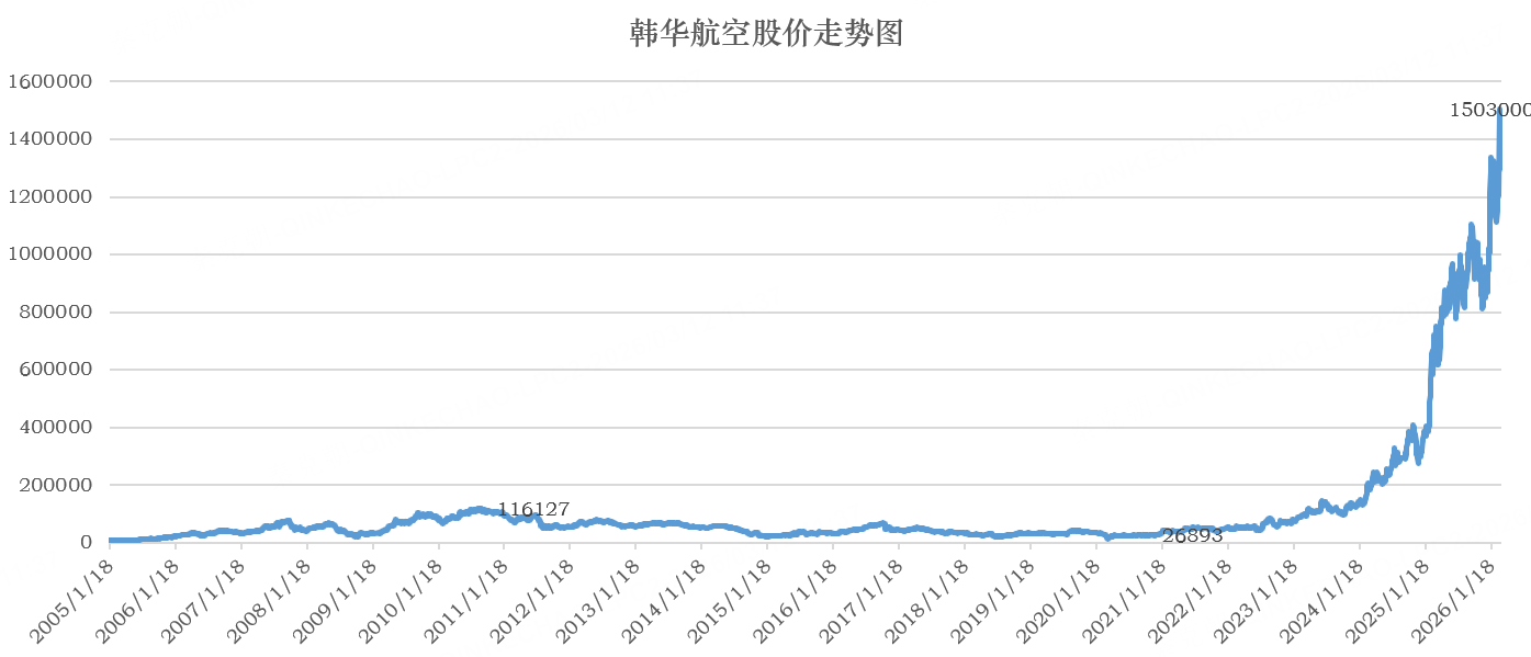 从股价上看,韩华航空波动较大,2010年-2020年持续下跌,2022年俄乌战争后,开启超级牛市行情:
