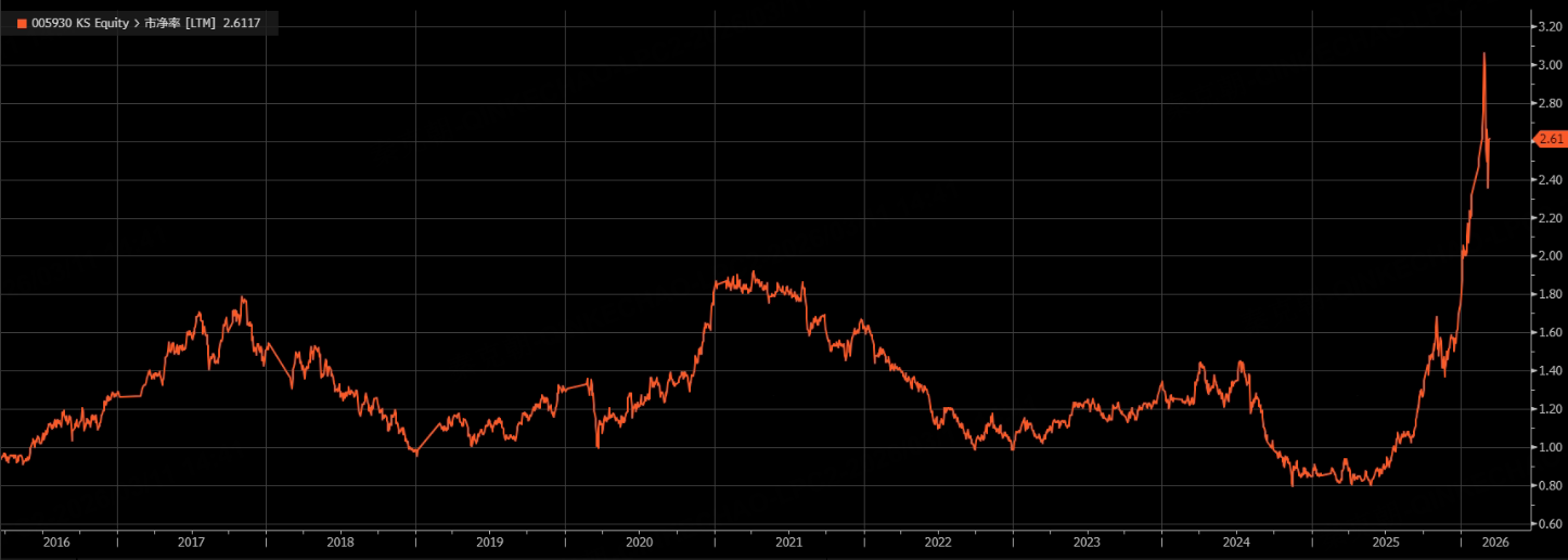 从估值上看,无论是三星电子还是SK海力士,市净率等处于史无前例的高位:三星电子2021年牛市巅峰估值1.9倍,目前为2.6倍;SK海力士2021年牛市巅峰时估值1.9倍,目前为5.5倍: