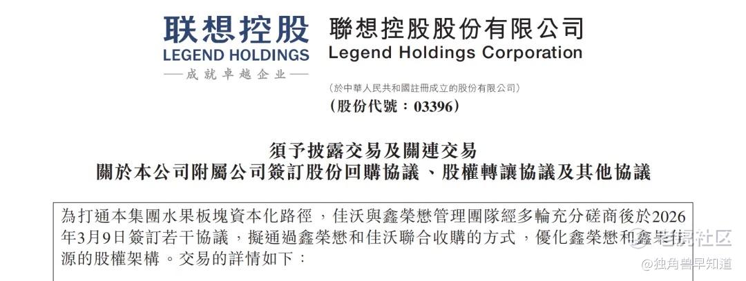3月10日,联想控股发布公告称,为打通集团水果板块资本化路径,推进鑫荣懋果业科技集团股份有限公司(鑫荣懋)上市工作,佳沃与鑫荣懋管理团队经多轮充分磋商后于2026年3月9日签订若干协议,拟通过鑫荣懋和佳沃联合收购的方式,优化鑫荣懋和鑫果佳源的股权架构。 $联想控股(03396)$