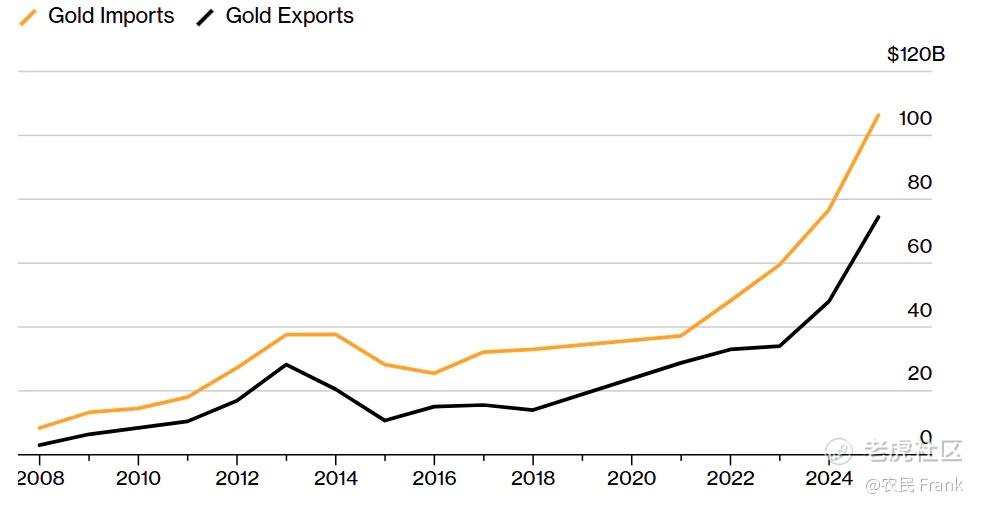 根据海关与贸易数据,迪拜在 2024 年全年进口黄金 1392 吨,总价值超过 1000 亿美元,出口规模亦高达 740 亿美元,这使得阿联酋成为全球第二大黄金进出口中心。譬如在非洲开采、阿联酋提炼的黄金,以及从瑞士、伦敦中转运往亚洲的黄金,相当大比例都要经过迪拜这个节点。