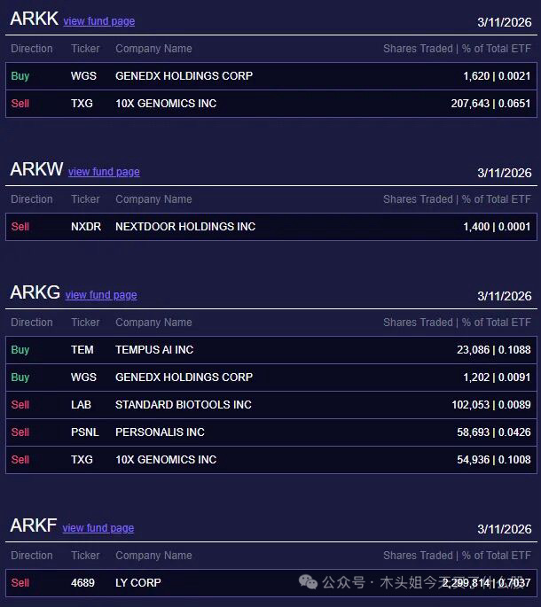 木头姐今天买入24万美元WGS、120万美元TEM。买的不多,这几天卖的也不多,大概在等待更好的机会吧。