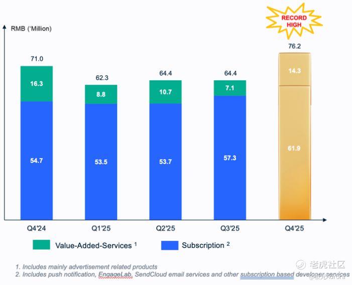 作为极光的根基业务,开发者服务在第四季度实现收入7620万元,同比增长7%,环比增长18%。其中,核心的订阅服务收入达到6190万元,再度刷新历史最高水平,同比增长13%,环比增长8%;增值服务收入为1430万元。全年来看,开发者订阅服务的收入留存率(NDR)稳定在103%的高位,表明极光不仅获客能力强劲,老客户客单价也在持续提升,构成了增长的“基本盘”。