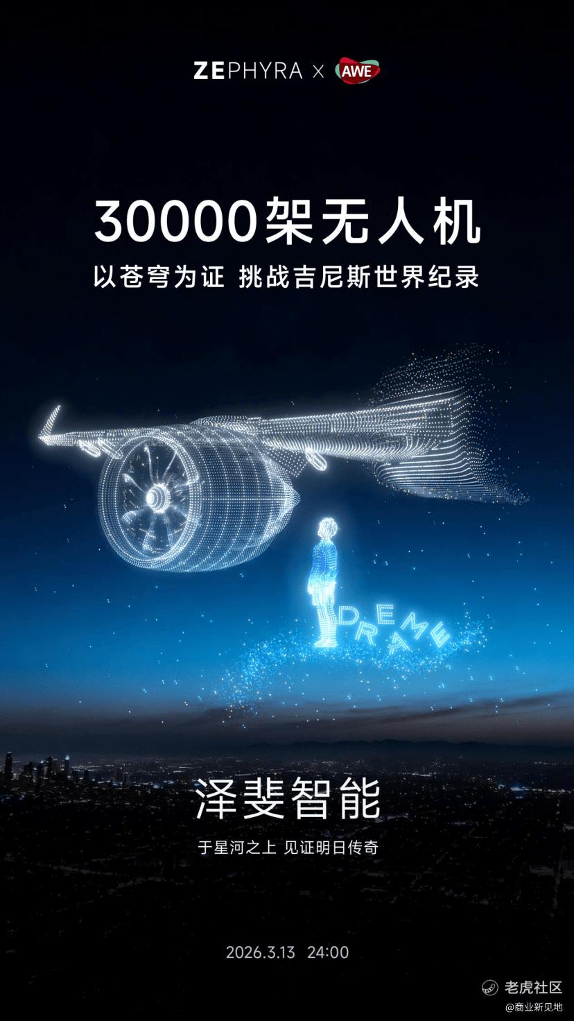 近期,追觅官方重磅预告:追觅泽斐智能将于3月13日晚在上海普陀区夜空呈现一场史无前例的表演。届时,追觅将以30000架无人机齐飞盛况,挑战吉尼斯世界纪录。