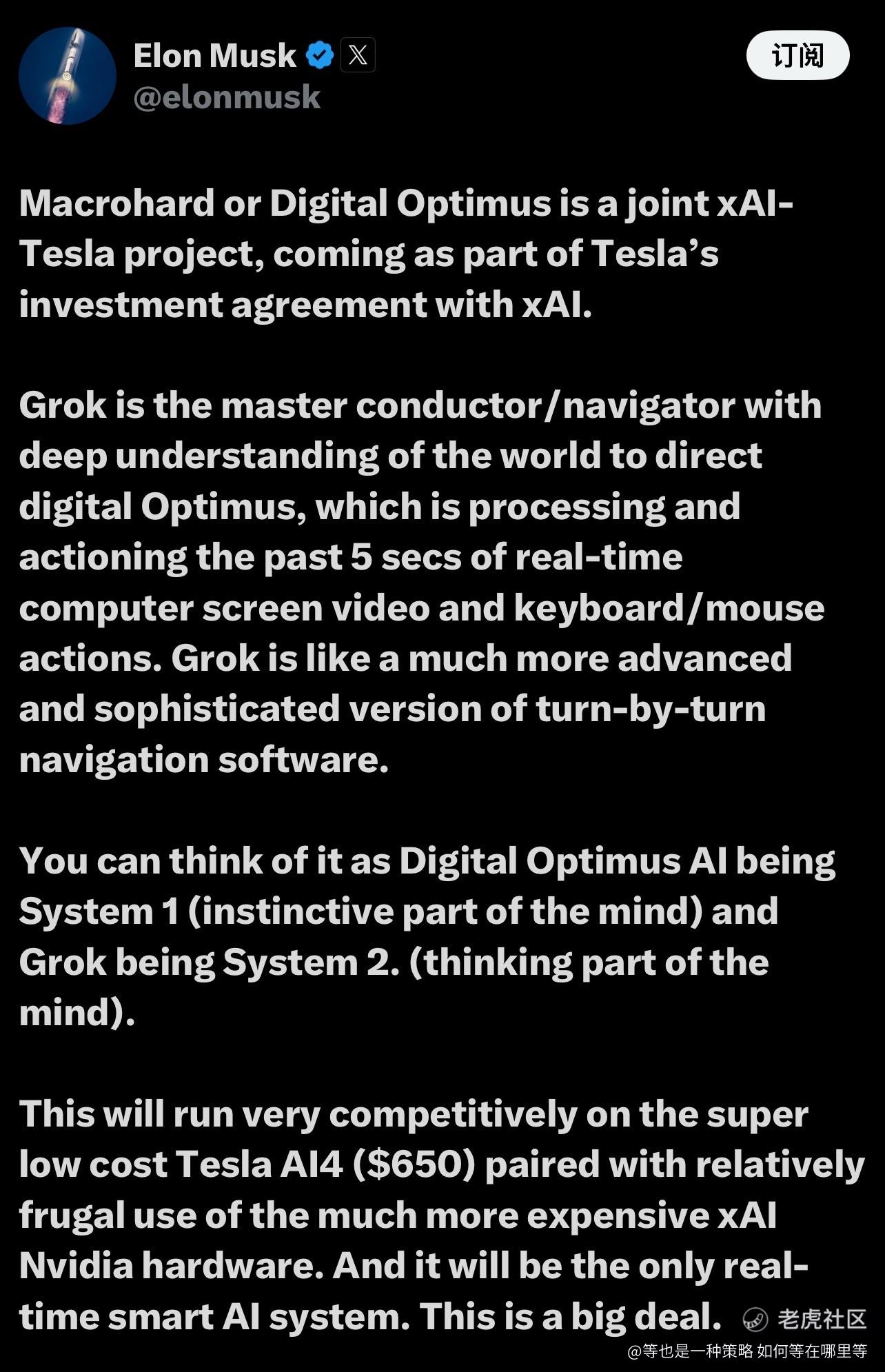 这是 $TSLA Tesla 与 xAI 的联合 AI 系统,也是 Tesla 投资 xAI 协议的一部分。