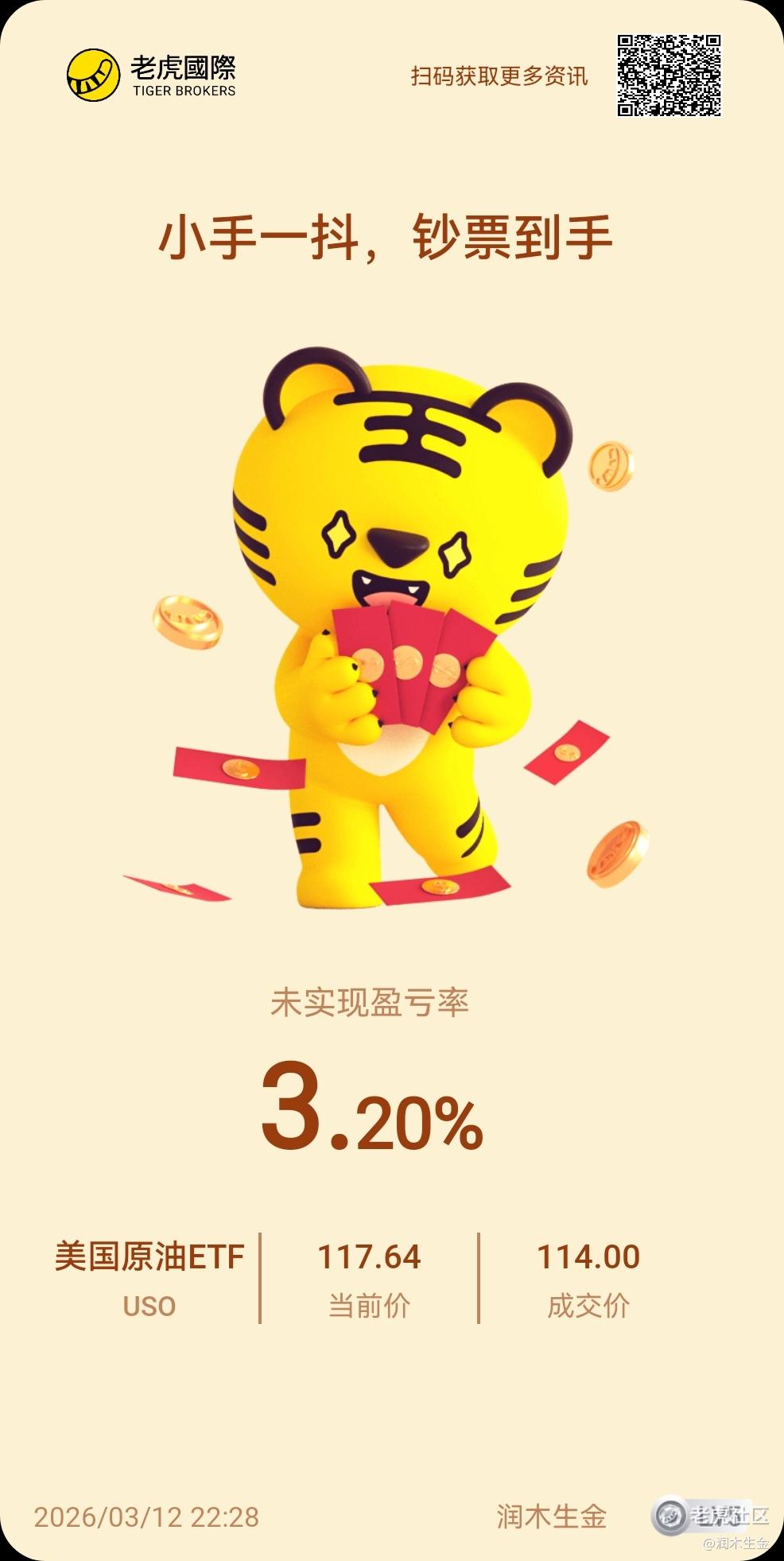 $美国原油ETF(USO)$ 白天116先撤了,今天看情况可以再次买入,你们一会卖点一会又卖点,手续费不要钱嘛?放着就好了哇,昨天106涨到116,睡了一晚一眼没看,趋势没变,情况就是这么个情况,不必要盯盘
