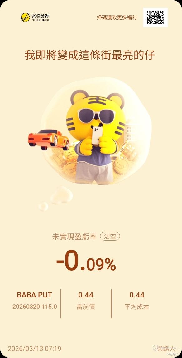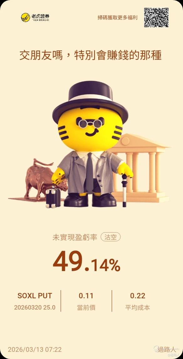 哗星期四$恒生指数(HSI)$ 已经大跌182点。夜期又大跌有无搞错呀。真系唔减持命都短几年。今次瓜得 $理想汽车(LI)$ 今次算系咁啦。盘前出业绩。一出就下跌。不过唔算跌好多。业绩预左唔好。看其每月交付量其实都可以估到。但又估唔到盘中竟然倒升。所以我都话算系咁啦。大市唔好最后都要下跌。 $三倍做多半导体ETF-Direxion Daily(SOXL)$ 惨啰一晚就跌咁啰。下个星期卖到25都好好价。我就冲了。 $阿里巴巴(BABA)$ 卖put下星期110之上既期权都好好架。虽然有业绩公布。但我觉得未必会大跌。落120之下。我都可能会买返。所以我卖put115 $SOXL 20260320 25.0 PUT$