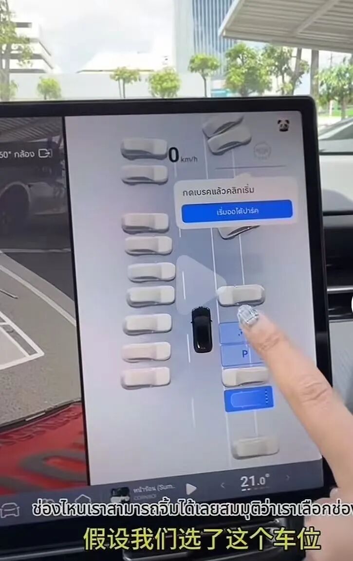 她选择了一个车位,然后按下自动泊车,接着她把双手抬起来,让镜头拍到:手没碰方向盘,脚没踩刹车,车子自己在动。