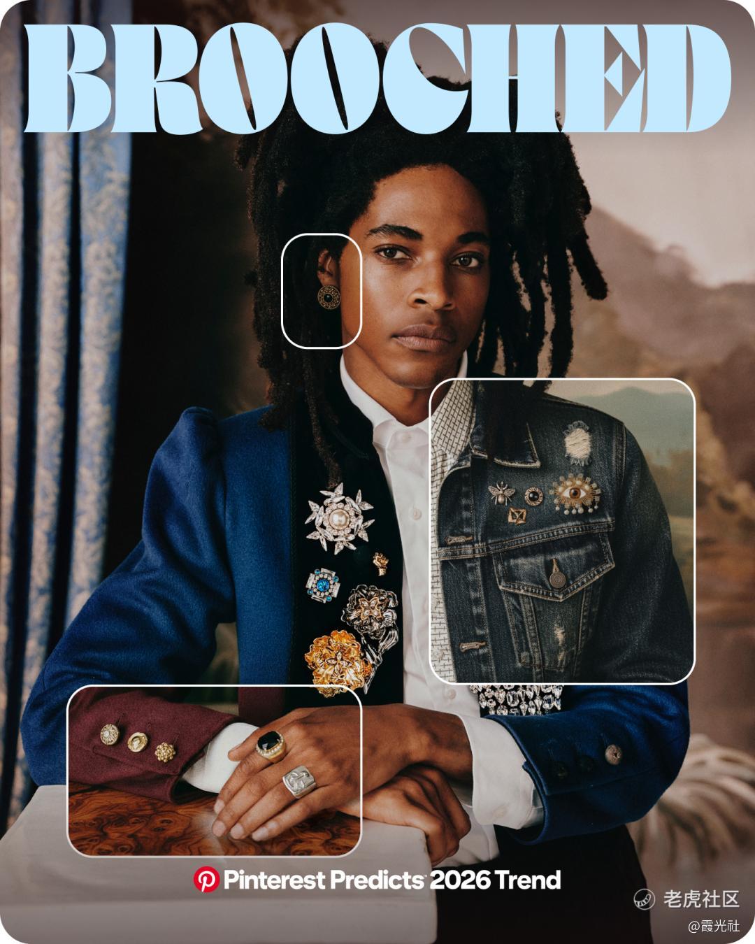 在 2026 的趋势预测中,Pinterest 则提到了“胸针”这一概念。有趣的是,胸针似乎和谷子文化中的“吧唧”有着极为相近的素材、佩戴场景和表现形式。某种程度上,胸针同样能够被赋予“身份象征”的表意,成为表达美学、寻找同类的载体。
