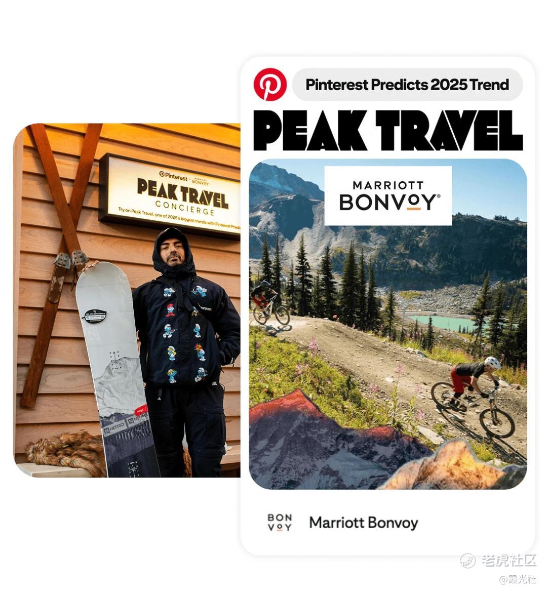 去年,当 Pinterest Predicts 2025 报告指出 Peak Travel (巅峰旅行)将成为流行趋势,预测山地景观与户外探险将成为 2025 年最热门的旅行方式,Marriott Bonvoy (万豪旅享家)敏锐发现这与其户外旅行产品高度契合,迅速与 Pinterest 达成战略合作,启用 Pinterest Premiere Spotlight (顶级焦点展位),让品牌在消费者的关键旅行规划时段实现最大化曝光。