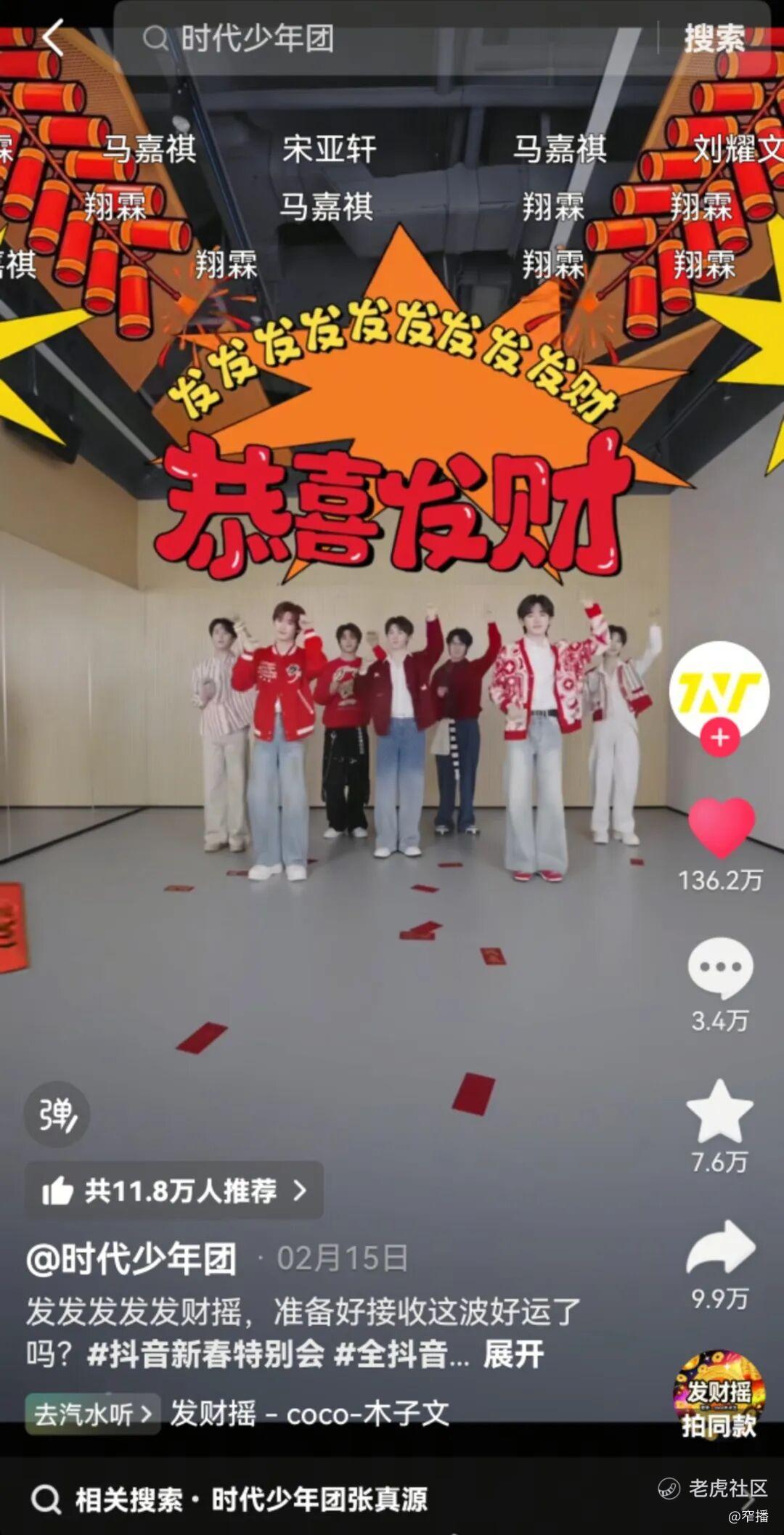 另外,平台还延伸出了全民互动环节,打造春节社交货币。满足网友许愿的时代少年团带来惊喜节目《发财摇》,单条视频获得了超过136万的点赞量。带动众多舞蹈音乐创作者,以及IP玩偶参与挑战,满载新春祝福的创意玩法不仅登上站内热点榜,更吸引到大量粉丝和抖音网友自发打卡传播,在全民挑战发财摇的氛围中形成「观看+参与」的沉浸体验。