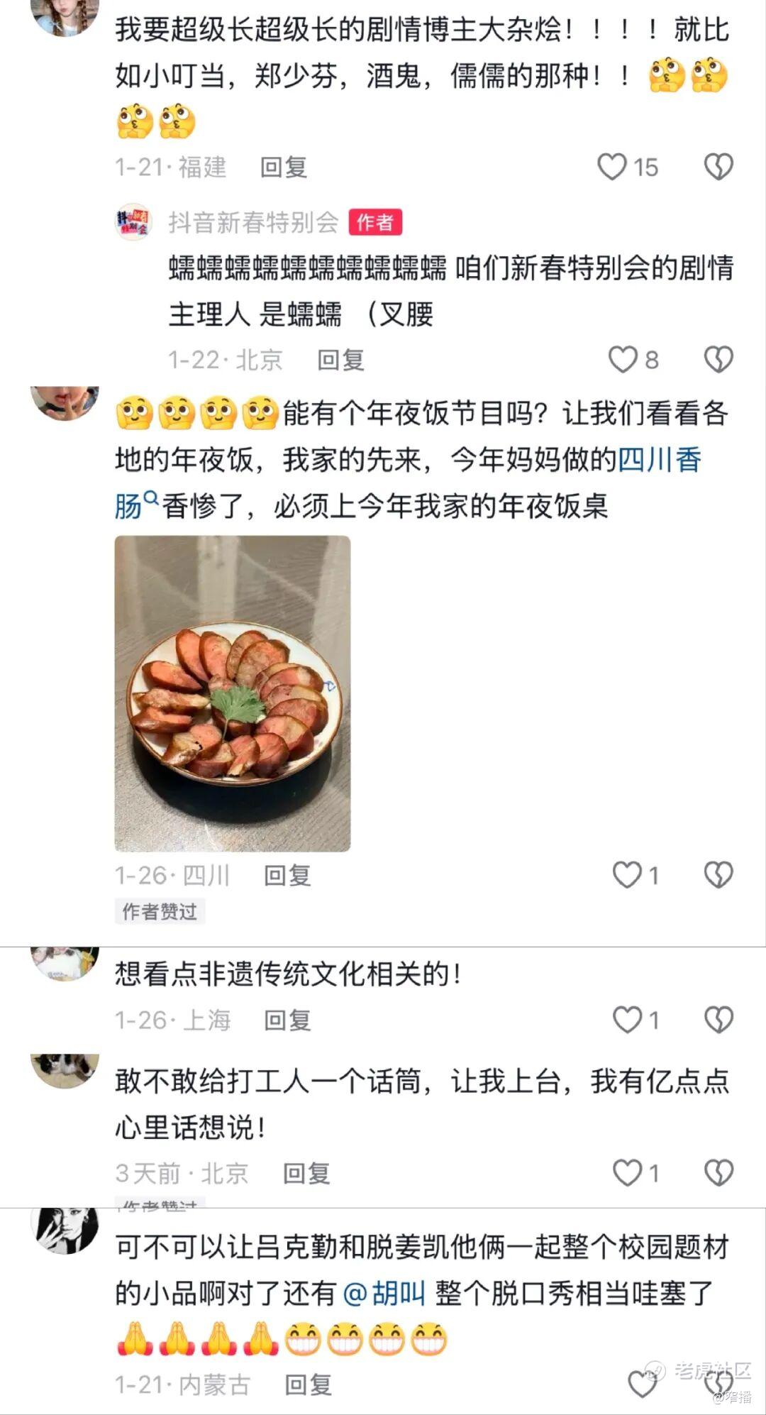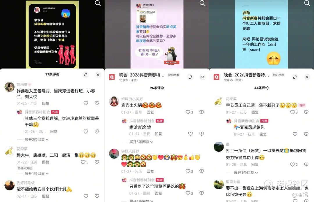 「想看剧情博主联动」「来点非遗文化相关的」「想回到千禧年」「能有个年夜饭相关的节目吗」……从特别会开放许愿池,网友争做策划贡献想法,到直播当晚成片播出,整场特别会都是对「全民共创」的极致化实践。