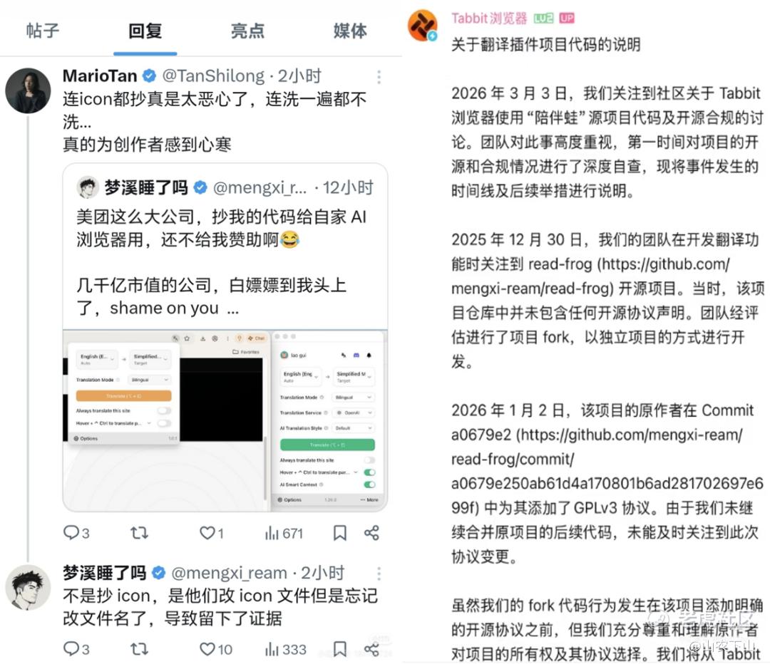 至少,C端感知不明显。从定位生活小秘书的Agent 小美,到内置Agent“问小团”,再到最近上线的AI浏览器Tabbit,这些AI产品的关注度都不算高。为数不多的话题,只有Tabbit的抄袭风波。这还只是因为人类天然对坏消息感兴趣,与它的重要程度无关。