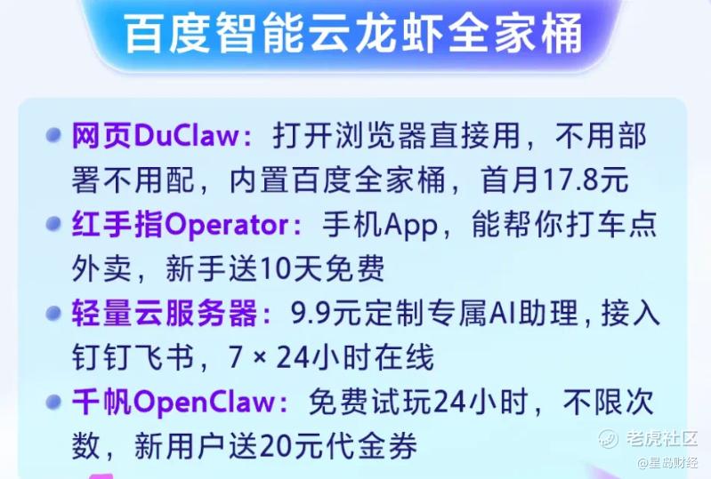从发布即开即用、内置百度搜索、百科等核心优势Skills的零部署服务DuClaw,再到发布全球首款手机龙虾应用——红手指Operator,目前百度的“龙虾全家桶”似乎已初步成型,并实现了从云端到移动端的全场景覆盖,让不同需求的用户都能实现零门槛“养虾”。