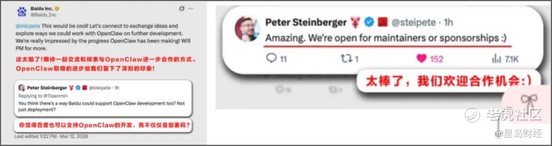 在点评腾讯版“龙虾”之后,3月12日,OpenClaw创始人PeterSteinberger在百度官方发布的多条OpenClaw相关海外社交帖子下接连点赞,并评论称“Amazing”,同时直接询问百度智能云能否支持OpenClaw的开发,“期待探索合作机会”,让这场AI智能体的赛道角逐增添了国际合作的想象力。