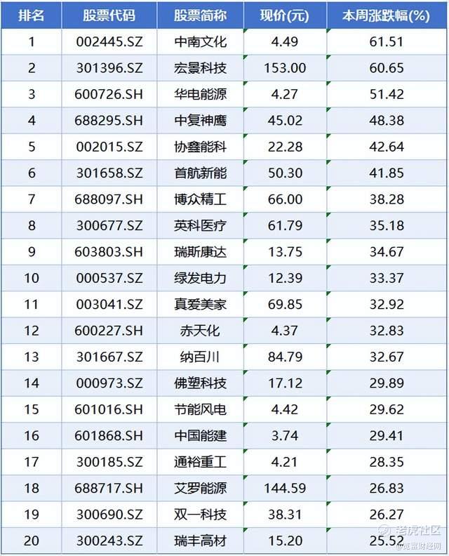 个股方面,本周个股涨幅榜前五位分别是中南文化、宏景科技、华电能源、中复神鹰、协鑫能科,累计涨幅分别为61.51%、60.65%、51.42%、48.38%、42.64%。