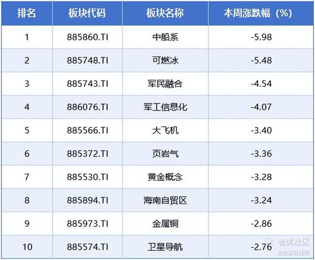 本周排在跌幅榜前排的概念板块分别是中船系、可燃冰、军民融合、军工信息化、大飞机,累计跌幅分别为5.98%、5.48%、4.54%、4.07%、3.40%。