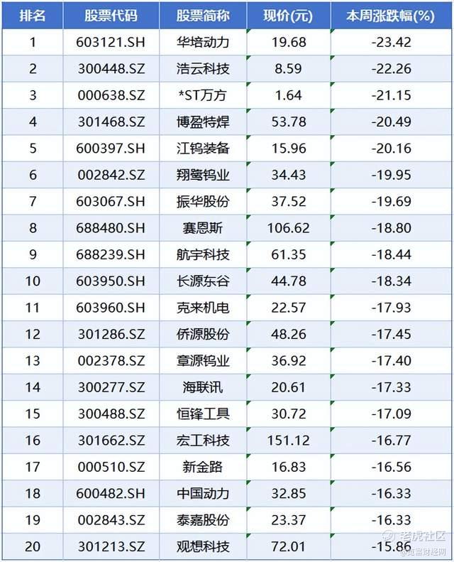 本周个股跌幅榜前五位分别是华培动力、浩云科技、*ST万方、博盈特焊、江钨装备,累计跌幅分别为23.42%、22.26%、21.15%、20.49%、20.16%。