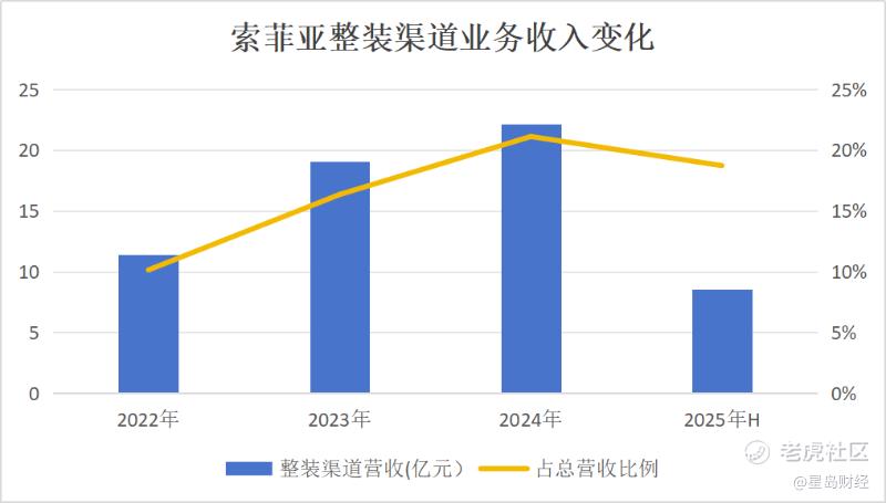 以索菲亚为例,2022—2024年其整装渠道收入从11.38亿元增长至22.16亿元,占总营收比例从10.14%升至21.12%;2025年上半年,该业务收入出现下滑,录得8.52亿元,同比减少13.24%,占营收比例仍达到18.72%。