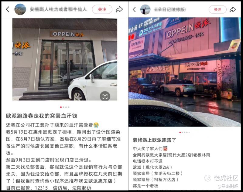 无独有偶,整装龙头欧派家居同样多次陷入经销商跑路风波。过去一年以来,陕西、浙江、广东、安徽等地接连出现欧派经销商资金链断裂、关门失联的情况,消费者支付定制家具与整装款项后无法生产、无法安装、无法退款。面对维权诉求,欧派总部以相关收款与违约行为系经销商个人行为,与品牌总部无关为由,并未予以直接兜底。