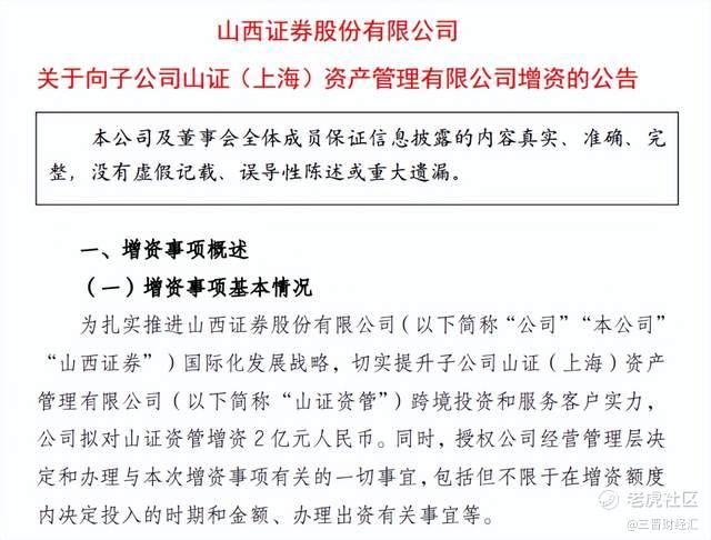 3月13日,山西证券发布公告,拟以自有资金向全资子公司山证(上海)资产管理有限公司(以下简称“山证资管”)增资2亿元人民币,以提升其跨境投资和客户服务实力,助力公司国际化发展战略落地。
