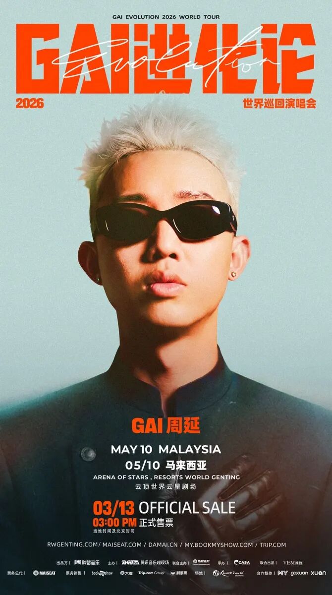 3月13日,知名说唱歌手GAI(周延)的“GAI进化论”2026世界巡回演唱会马来西亚站门票正式开售,大麦国际(MAISEAT)作为本场演出的联合主办方和票务总代理,全面负责票务分发与销售渠道管理。