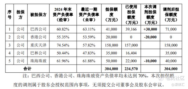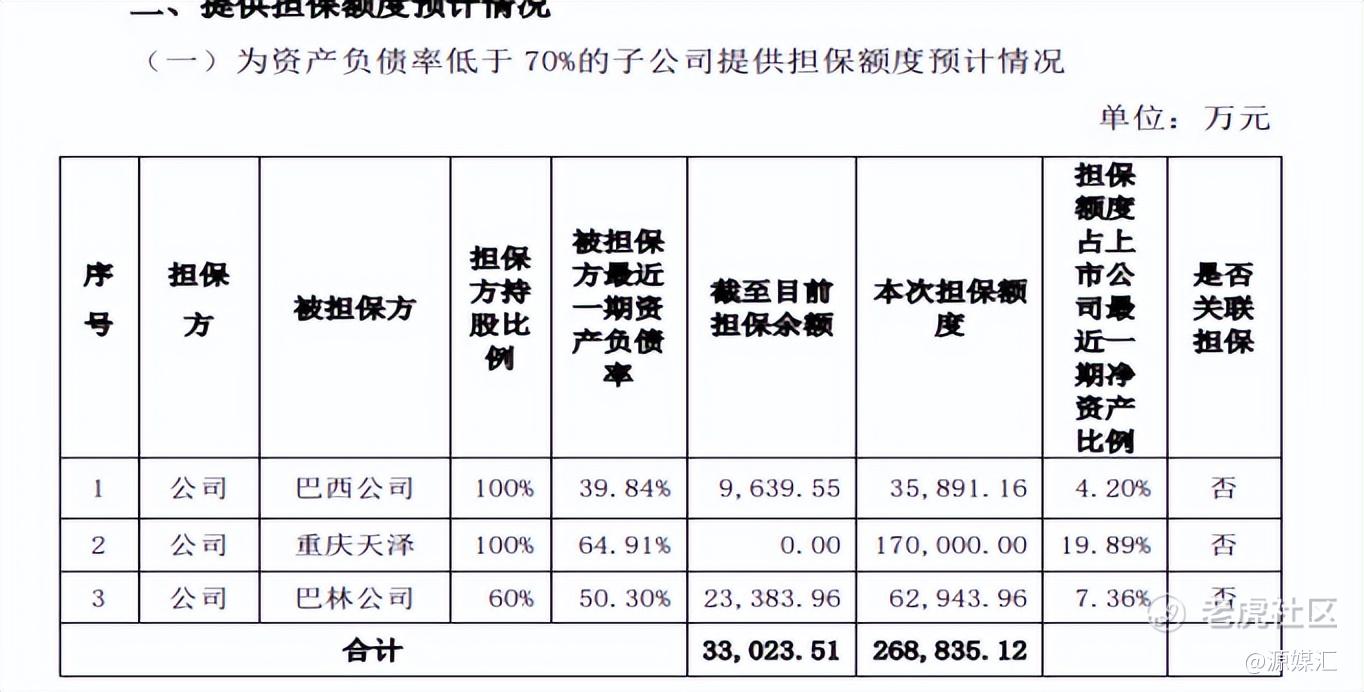 上述调剂之后,巴西公司的担保额度从4.1亿元上升至7.1亿元。